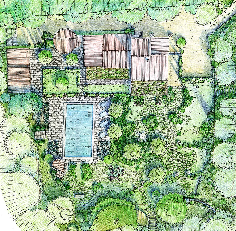Une fontaine étonnante et mystérieuse, un ancien aqueduc romain, un magnifique chêne, une chapelle au loin sur la colline. Le jardin est dessiné en plusieurs jardins dédiés à chaque espace de la maison reliés par une promenade romantique. Le jardin est fait de plantes méditerranéennes endémiques et le gazon est remplacé par des plantes “tapissantes”.